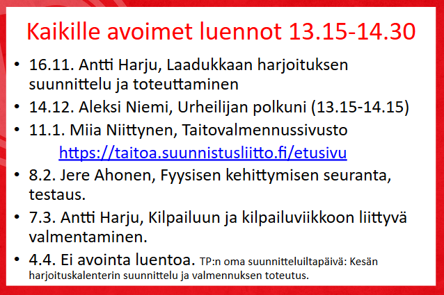 Alla on kuvat talven valmennuksellisten aiheiden ohjelmasta.
