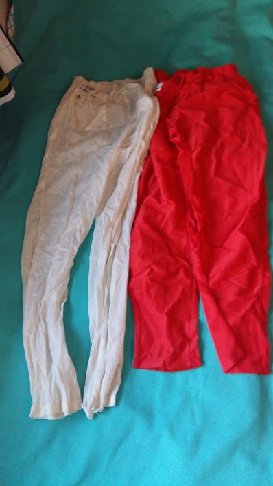 Suunnistushousuja, valkoiset 150cm, punaiset 140cm sekä 150cm, 1€/kpl.