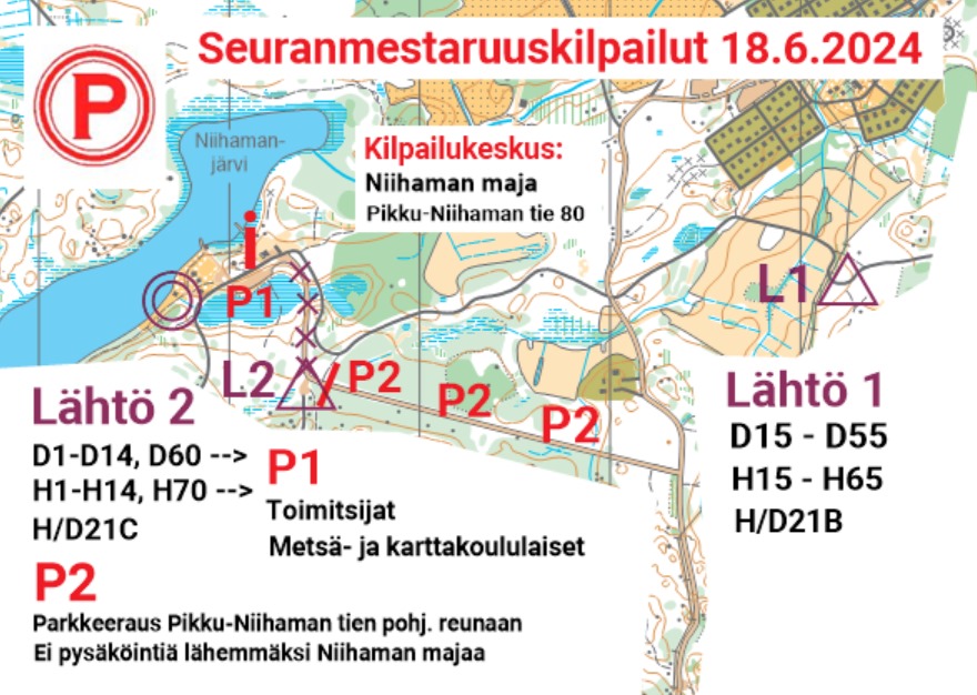 | Description | Seuranmestaruuskilpailut Niihaman majalla Pyrinnön seuranmestaruuskilpailut Niihaman majalla. Lähdöt Iltarastityyliin klo 18.00 - 19.00, maali sulkeutuu klo 20.15. Seuranmestaruuskilpailujen yhteydessä järjestetään myös OPK:n ohjattu harjoitus(kisa), jonka takia lähdöt vasta klo 18.00 alkaen. Kaikille kilpailuun osallistuneille tarjoillaan munkki ja mehu. llmoittautuminen Huom! Tähän kalenteriin ilmoittautuminen muille kuin Oravapolkukoululaisille. OPK:n ilmoittautuminen TÄMÄN LINKIN KAUTTA. Ilmoittautuminen ke 12.6. Klo 21.00 mennessä. Ilmoita sarjasi ja mahdolliset allergiat lisätietokentässä, ks. malli ilmoittautumisesta alla. Kilpailukeskus Kilpailukeskuksena toimii Niihaman maja: Pikku-Niihaman tie 80, 33560 Tampere Saapuminen / Pysäköinti