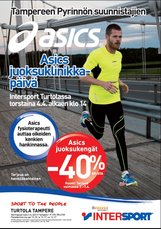 Yhteistyökumppanimme Intersport Turtola ja Patrol Oy tarjoavat jälleen kaikille suunnistusjaostolaisille ja uutuutena myös Oravapolkukoululaisille vanhempineen ASICS-juoksukenkiä sh -40% erikoishinnoilla ajalla 2.-7.4.2012 Intersportin Turtolan liikkeellä. Viikon kokokohta on torstai 4.4. klo 14-20, jolloin paikalla on ASICS:in fysioterapeutti auttamassa juuri sinun jaloillesi ja juoksutyylillesi sopivien kenkien valitsemisessa. Erikoishintamme saat näyttämällä kassalla TP-jäsenkortin tai kertomalla, että tulet Pyrinnön OPK:sta.