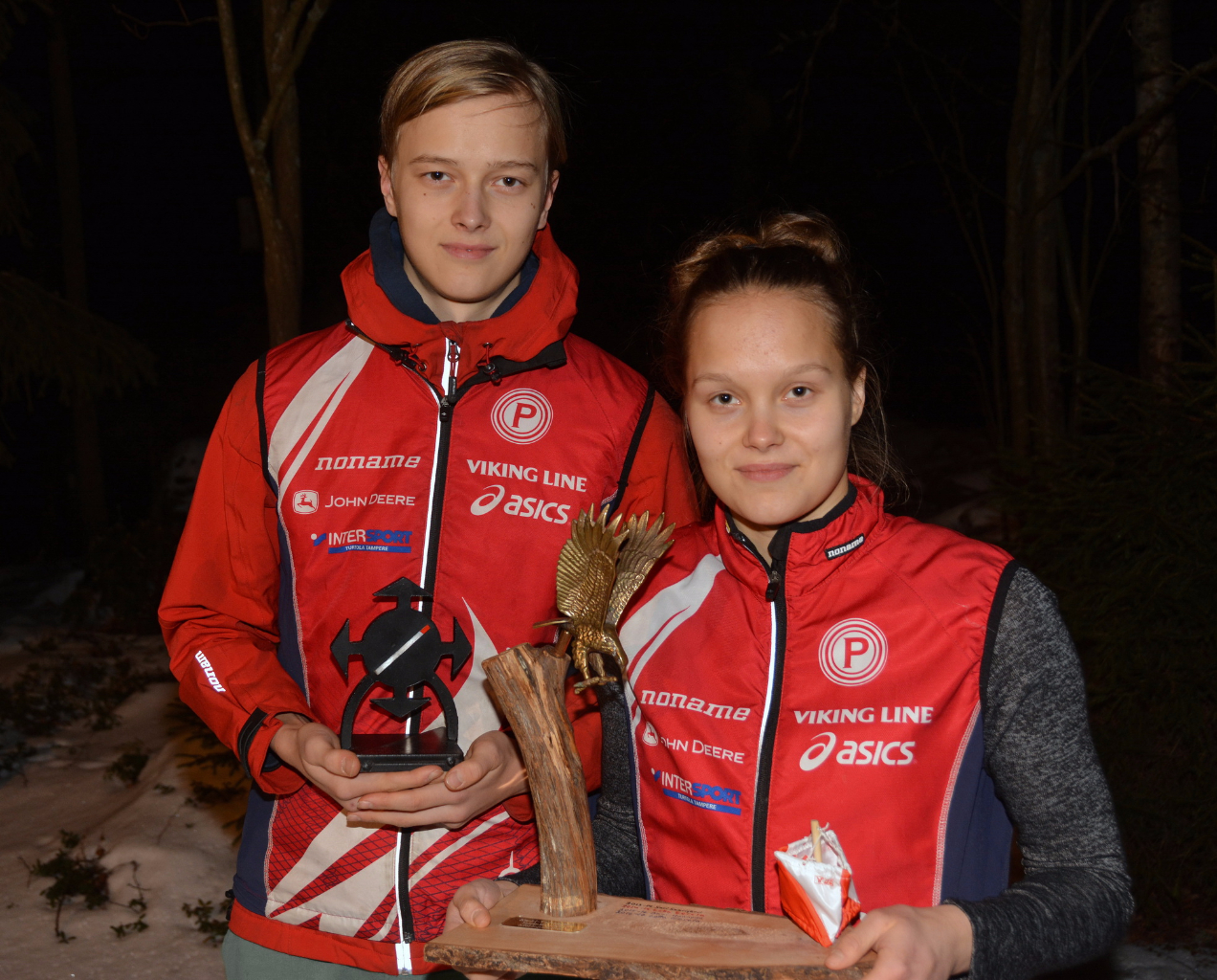 Kuvassa naisten ja miesten sarjan voittajat kiertopalkintoineen: Lotta Eerola, 16 ja Mikko Eerola, 16.