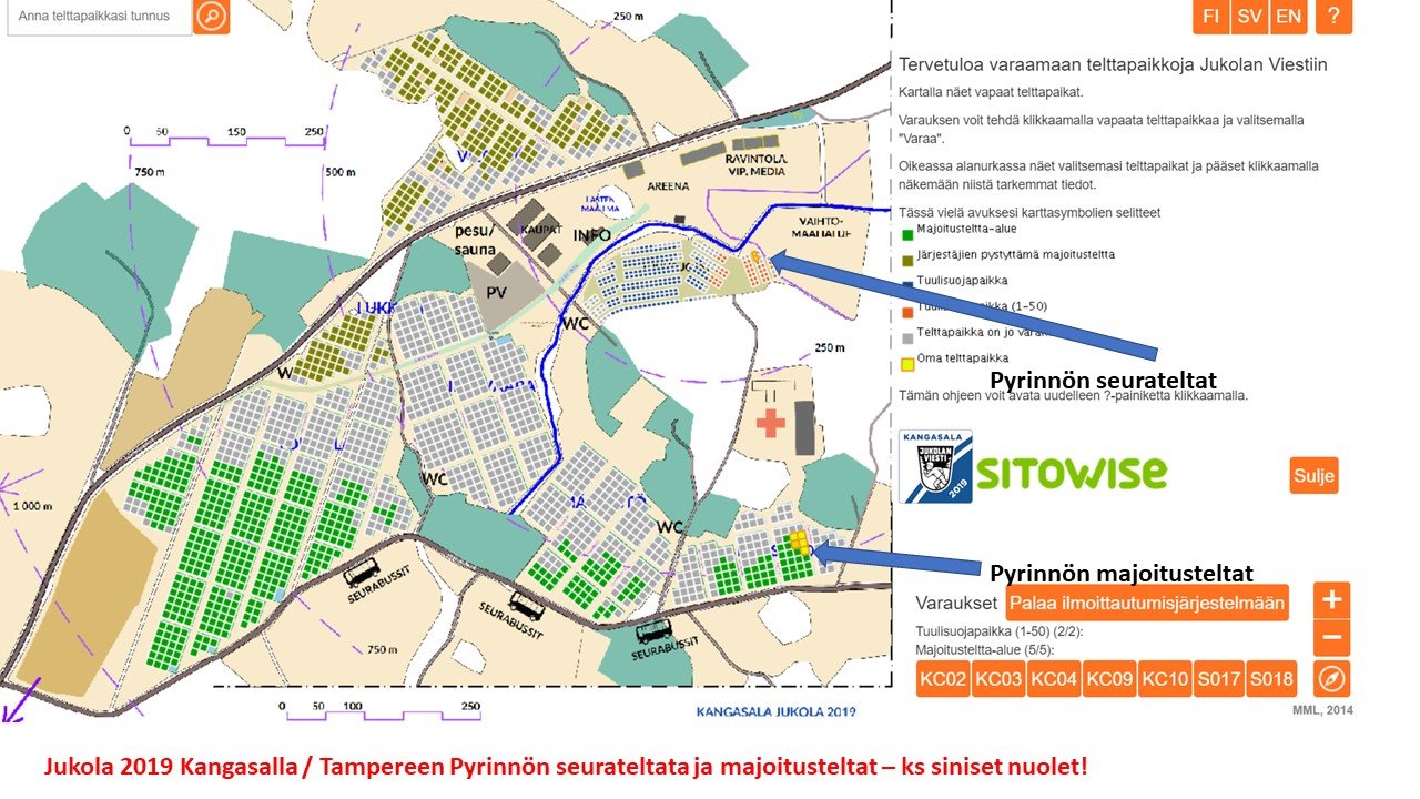 Pyrinnön sotilastelttapaikat, yht 5 ruutua, joihin pystytetään (viime vuosien tyhjistä teltoista oppineena) vain 3 telttaa - omille teltoille jää hieman tilaa: KC02, KC03, KC04, KC09, KC10. Ks kuva.