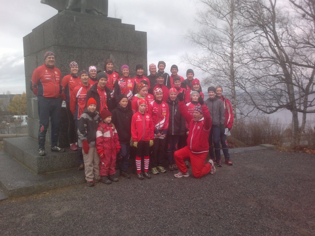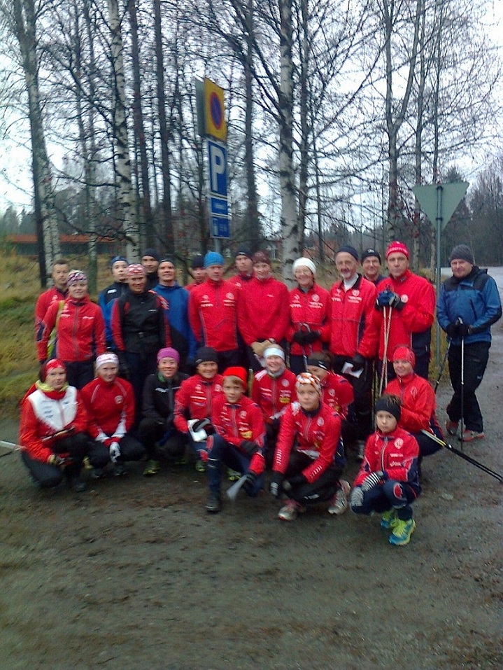 Sunnuntaiaamun yhteisharjoituksessa oli n. 30 reipasta osallistujaa tekemässä pienryhmittäin pitkää lenkkiä ja suunnistamassa käyräkartalla. Kaikki eivät ehtineet kuvaan, kun olivat jo maastossa ...