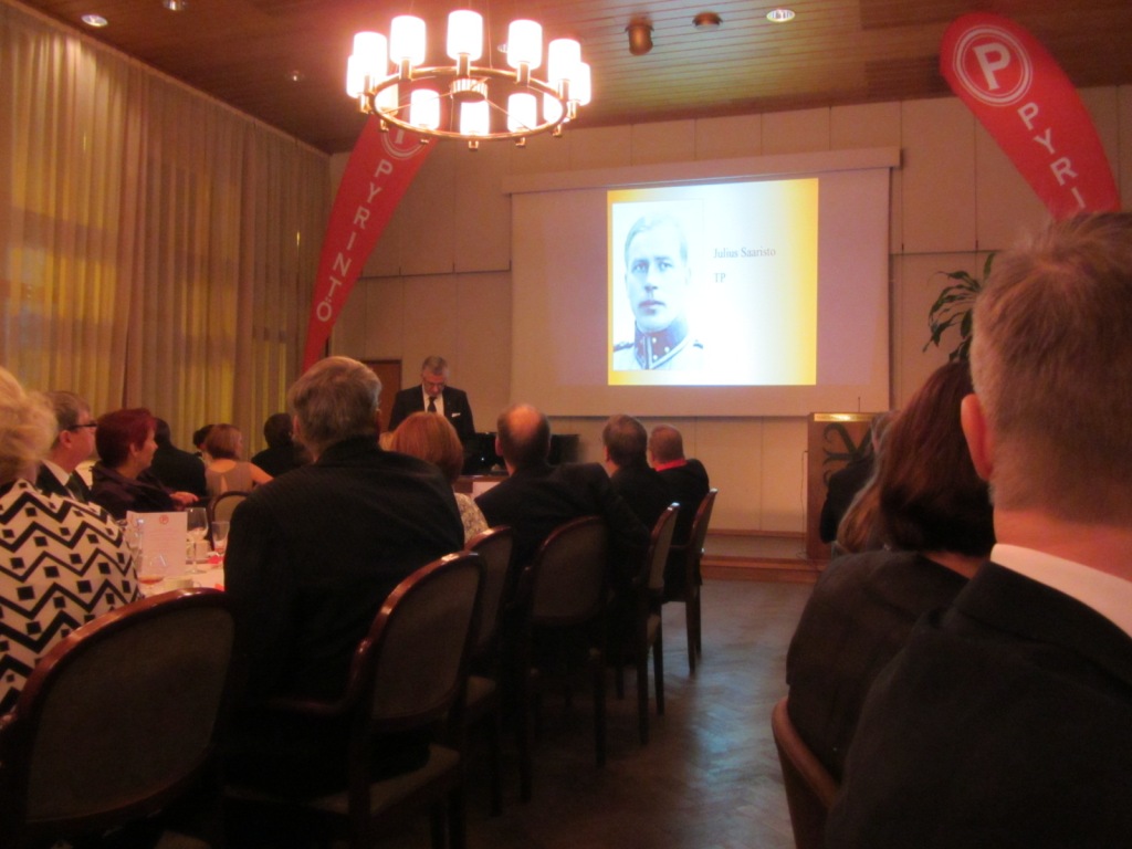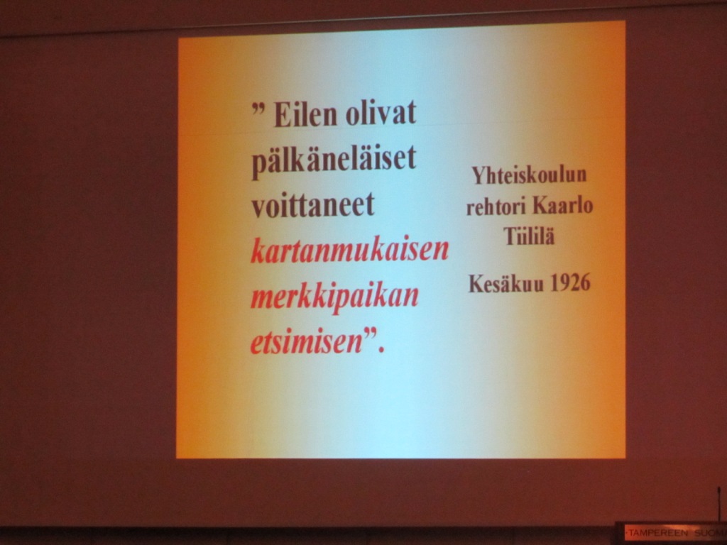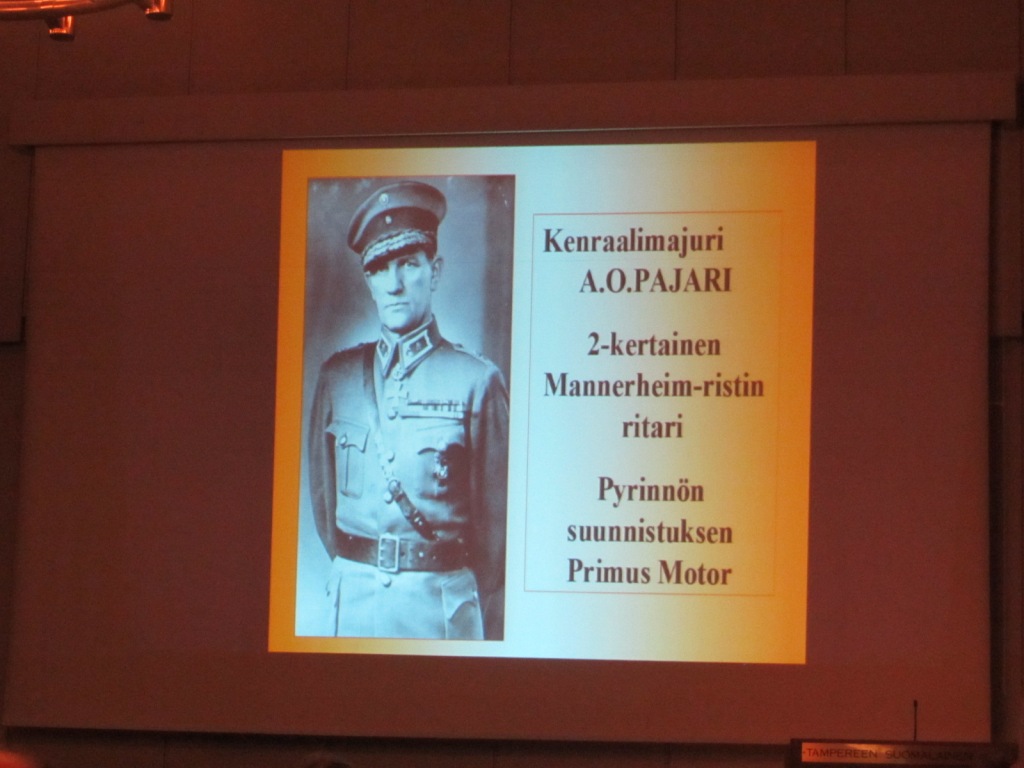 Voisi ajatella, että vatsat pömpöllään porukka nukahtaa 40 min esitelmän aikana. Mutta Tuomo Juntusen maaginen ja todella vaikuttava esitys suoraan 1920-30 –luvuilta oli todellakin mielenkiintoinen ja vangitseva. Historiallinen esitys valotti suunnistamisen/maastojuoksun/kartanmukaisen merkkipaikan etsimisen/tiedustelujuoksun yms eli suomalaisen suunnistuksen ja samalla Pyrinnön historiaa. Historiallisessa esitelmässään Tuomo valotti Tahko Pihkalan, kenraalimajuri Pajarin, Kustaa Kauppilan, Mannerheimin, Pyrinnön kunniajäsen Kekkosen jne rooleja suunnistuksen syntyhistoriassa Suomessa, Tampereella ja Pyrinnössä.