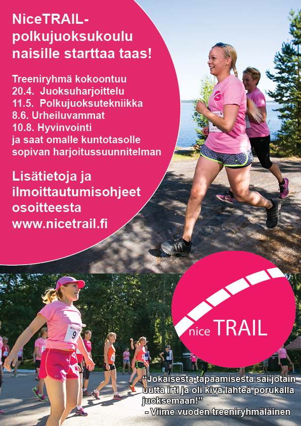 Punahilkat järjestää tänäkin kesänä naisille tarkoitetun polkujuoksutapahtuman 27.8. Tapahtumaan tähtäävä treeniryhmä starttaa kuitenkin jo 20.4. Kaikki aloittelijoista kokeneempiin juoksuharrastajiin ovat tervetulleita! :) Mainos löytyy alta, kutsukaa kaveritkin mukaan! Ilmoittautuminen tapahtuu sähköpostitse osoitteeseen anne.karhola@nicetrail.fi ja lisätietoja hinnoista ja muista asioista löytyy osoitteesta nicetrail.fi/treeniryhma.