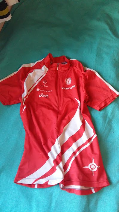 Suunnistuspaita, lyhyt hiha, vetoketjukaulus, koko S, 3€.