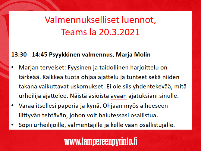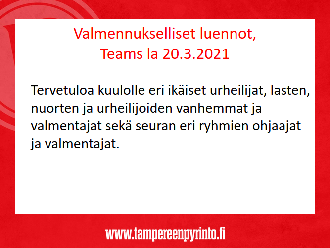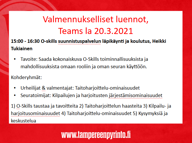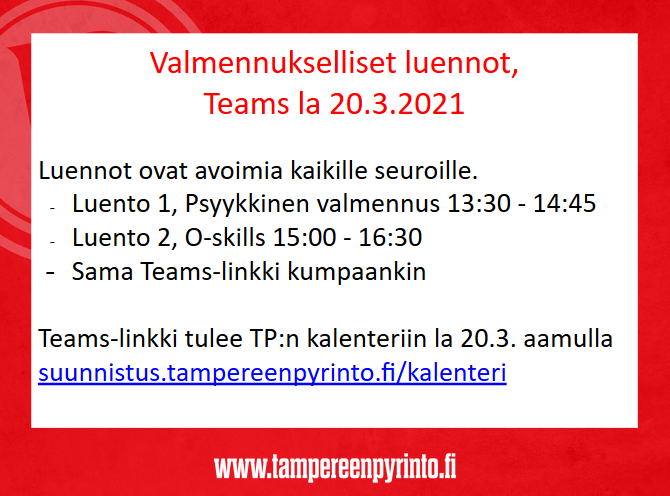 Teams-linkki julkaistaan kalenterissa 20.3. aamulla: http://suunnistus.tampereenpyrinto.fi/k ... e=20210320