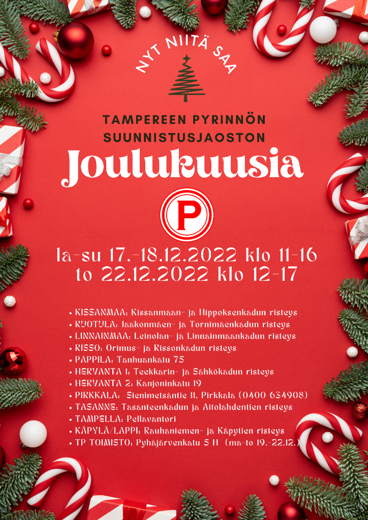 Tipeti tap, joulu lähestyy jo kovaa vauhtia ja sitä myötä myös Pyrinnön perinteinen joulukuusimyynti! Kuusia myydään jälleen usealla eri paikalla ja myyntipäivät ovat la-su 17.-18.12. sekä to 22.12. Kuusenmyynti on tärkeä osa koko suunnistusjaoston varainhankintaa ja siksi olisi hienoa, jos voisit olla mukana talkoissa varaamalla myyntivuoroja itsellesi. Mikäli joulun kiireiset aikataulut antaa myöden ja myynti-intoa riittää, niin sama henkilö voi varata itselleen myös useamman vuoron. Myyntivuoroja voi varata tältä lomakkeelta ja näkyvissä olevat vuorot ovat vielä vapaina, eli varattuasi vuoron, se häviää listalta.