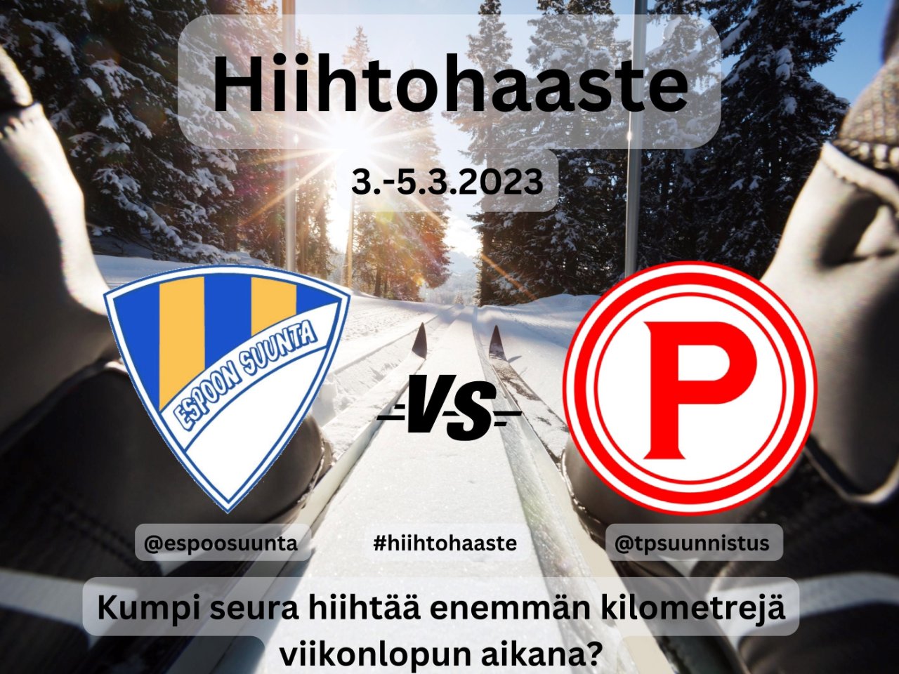 Espoon Suunta on haastanut Tampereen Pyrinnön suunnistusjaoston hiihtokilometrikilpailuun maaliskuun ensimmäisenä viikonloppuna 3.-5.3.2023. Haaste alkaa 3.3.2023 klo 00:00 ja päättyy 5.3.2023 klo 23:59.